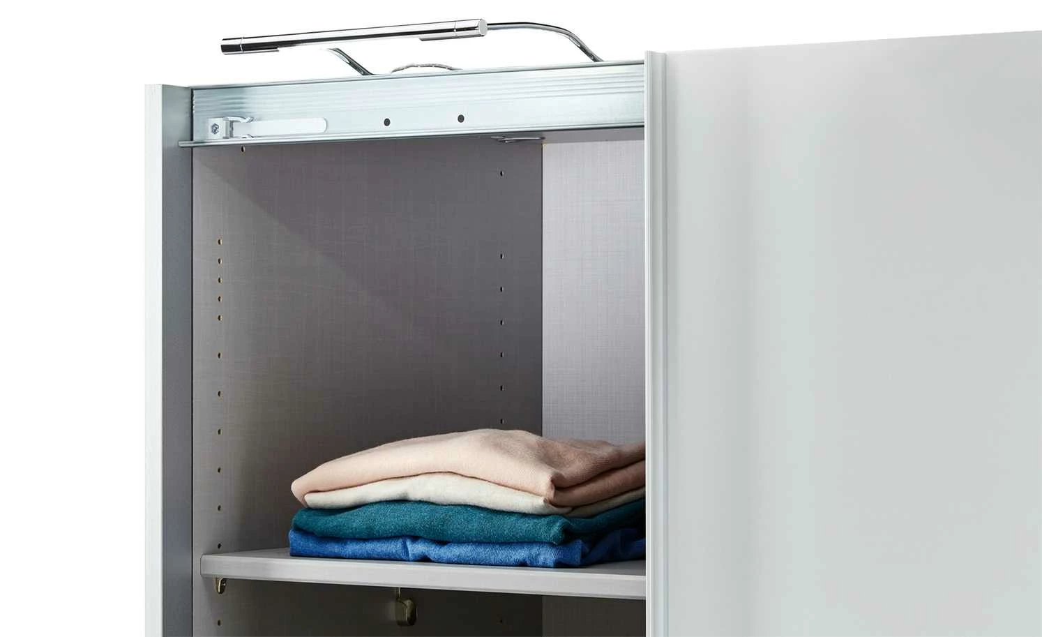 Dieses Aufbauleuchten-Set ist passend für den Dreamer Kleiderschrank. Zu dem Set gehören drei chromfarbige Leuchten. Siewerden einfach am oberen Rand des Schrankes angebracht. Mithilfe des Tretschalters wird die Beleuchtung an- und ausgeschaltet.