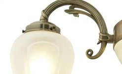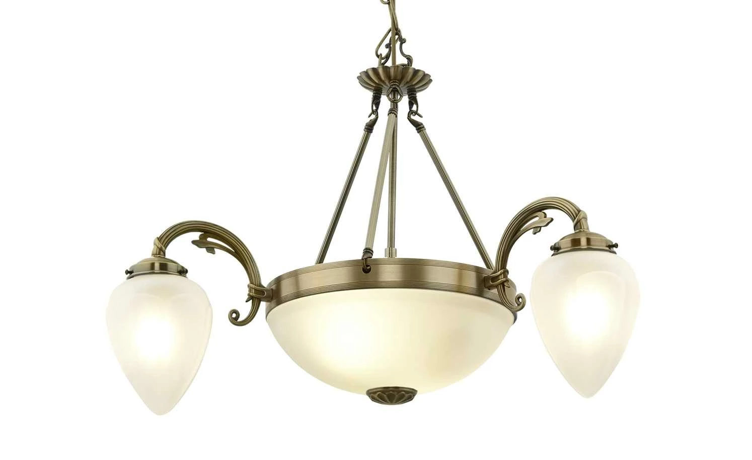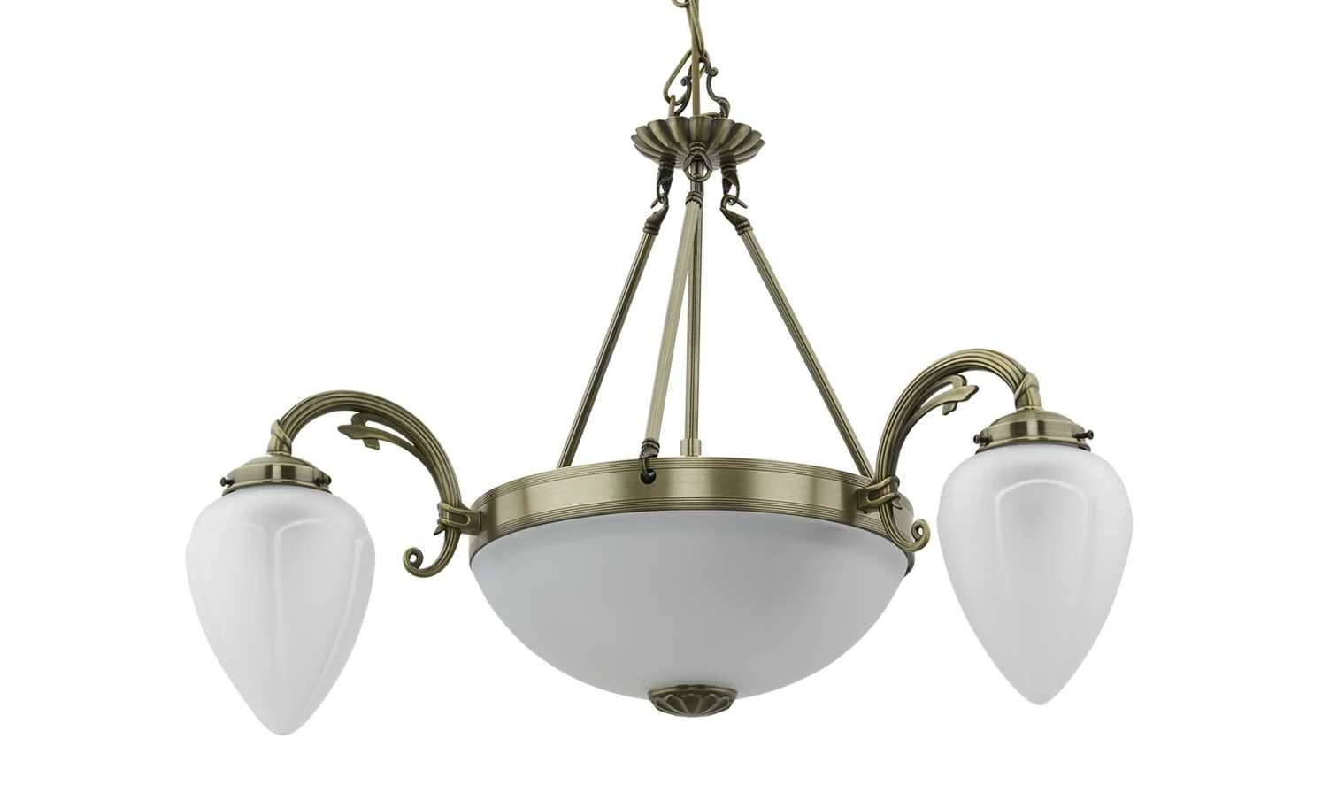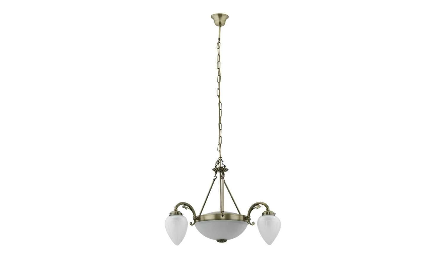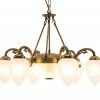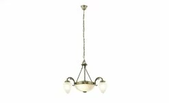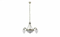 Dieser voluminös gestaltete Kronleuchter ist ein echter Blickfang für Ihren Wohnraum. Der Kronleuchter ist aus Messing hergestellt und überzeugt durch seine einfallsreiche Gestaltung. Über vier Streben ist der rundlich gestaltete Korpus mit dem Sockel verbunden, die fünf Flammen sorgen für angenehme Lichtakzente. Das für die Lampengläser verwendete weiße Glas harmoniert hervorragend mit dem Messing des Korpus und sorgt so für ein stimmiges, attraktives Gesamtbild.