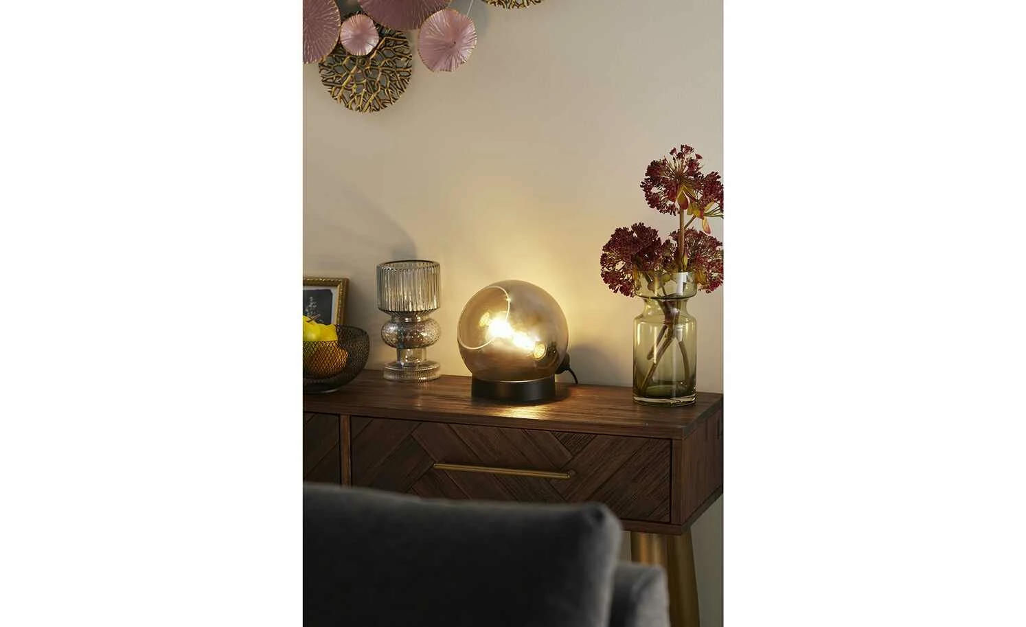 Tischleuchte, Glaskugel in Rauchglas
